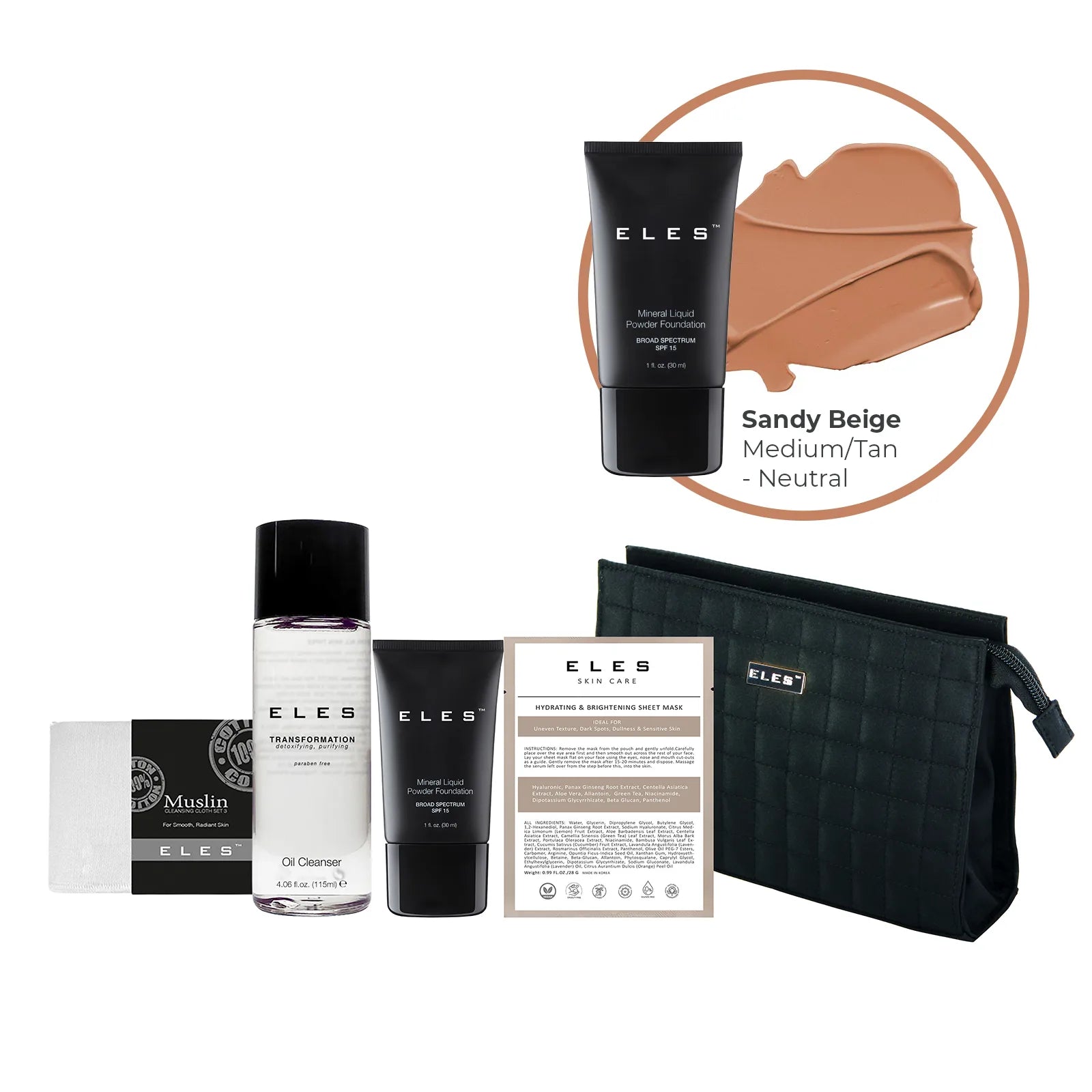 Begin by gently massaging the Transformation Cleansing Oil onto dry skin to dissolve makeup and impurities. Use the muslin cloths dampened with warm water to gently wipe away the oil and cleanse the skin. Follow with the Hydrating and Brightening Sheet Mask by applying it to clean skin for 10–15 minutes; remove and gently pat in remaining serum. For makeup, apply the Mineral Liquid Powder Foundation onto moisturized skin or over primer using a foundation brush or fingertips, blending evenly from the centre of the face outward.