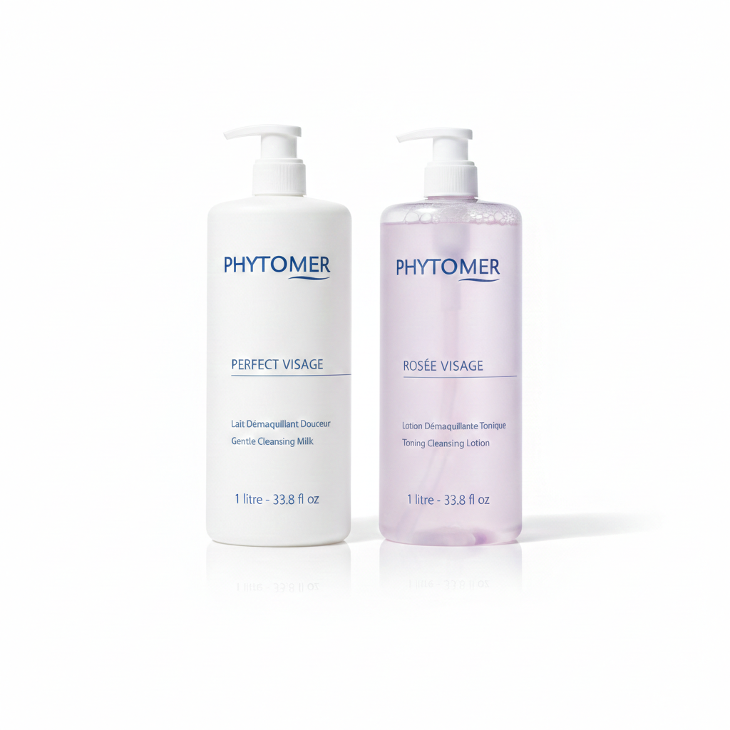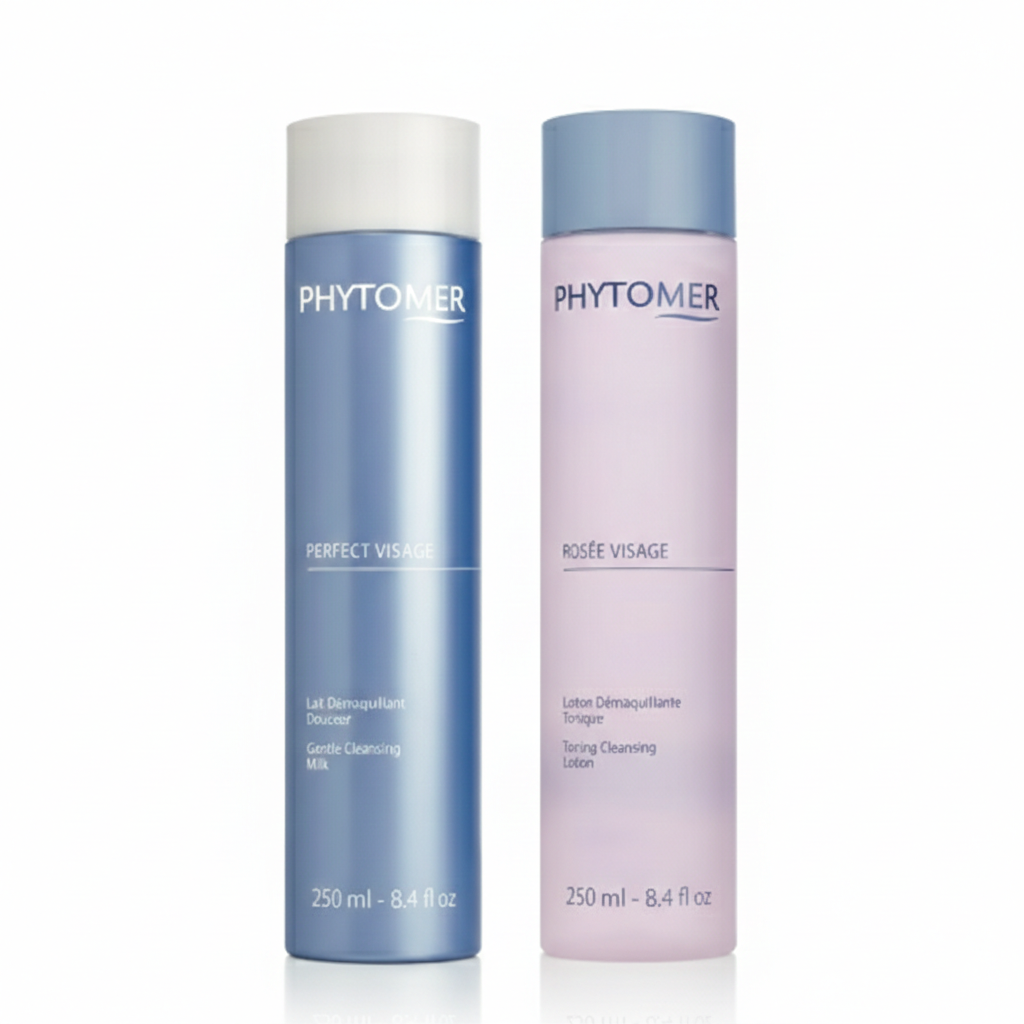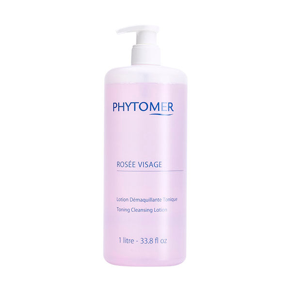 The Phytomer Rosée Visage Toning Cleansing Lotion effortlessly removes makeup, sunscreen, and daily impurities while also toning the skin, no rinsing necessary.