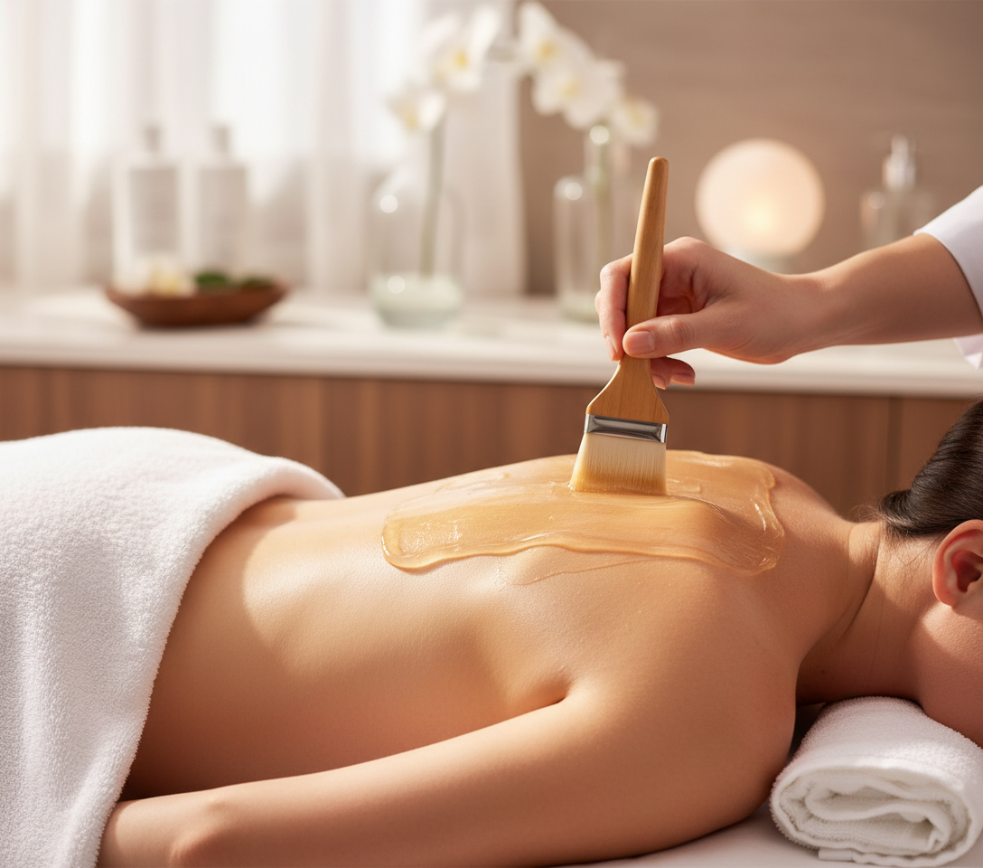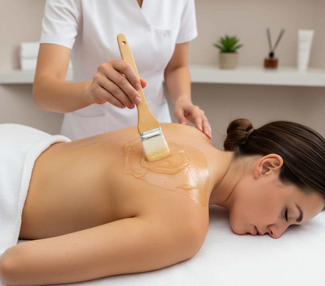 Wearing rubber gloves, begin applying the Water Lily After Sun Soothing Wrap in a thin even layer all over the back side of the client.